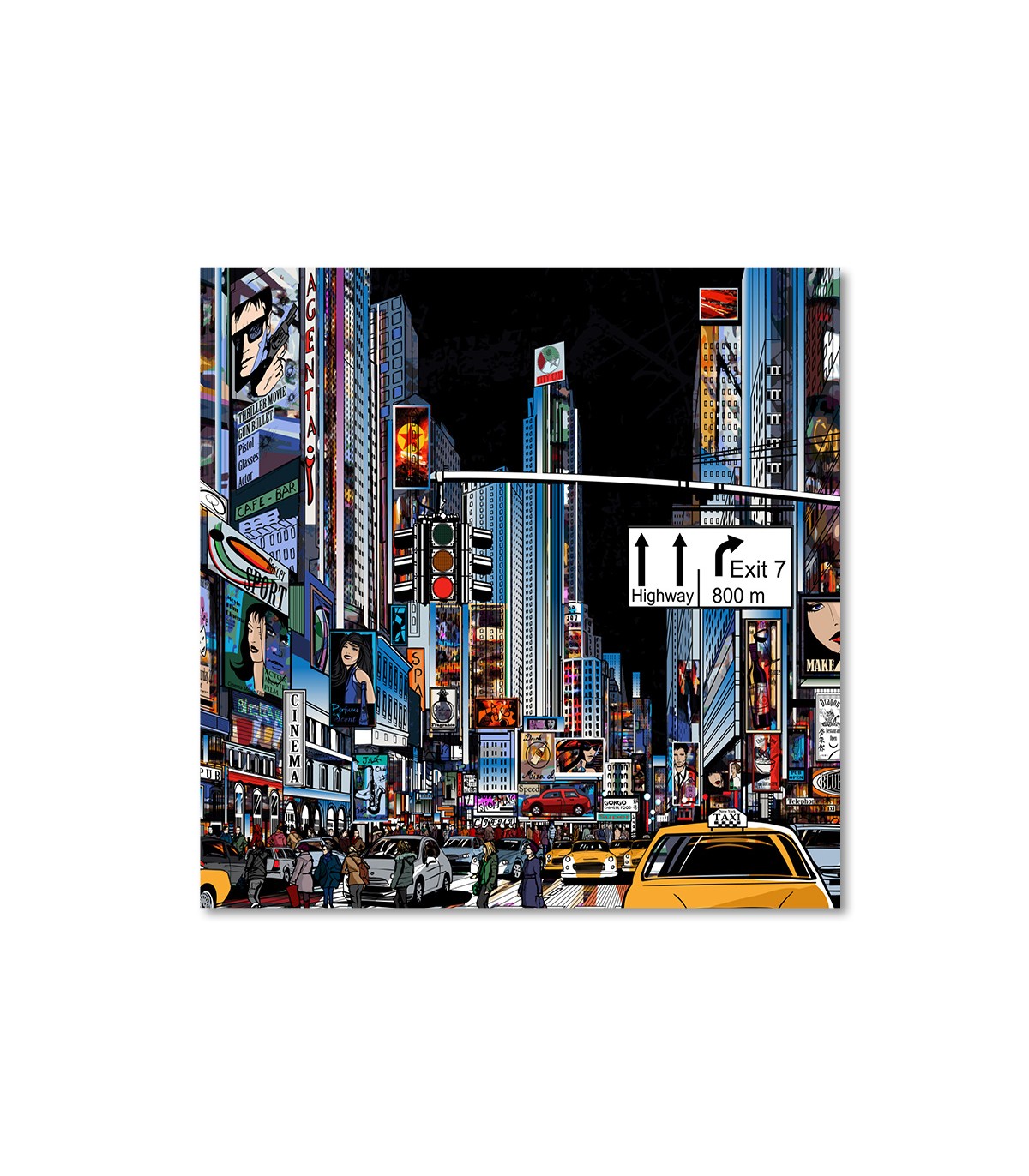 El lienzo ciudad nocturna con luces y trafico urbano es una pieza visualmente impactante que representa el bullicio de una gran metropoli iluminada por neones y farolas. Esta escena urbana captura el ritmo acelerado de la ciudad por la noche, con rascacielos llenos de anuncios, carteles coloridos y una avenida principal repleta de vehiculos, taxis y peatones cruzando. El cielo oscuro sirve de contraste perfecto para resaltar los detalles brillantes de la composicion.