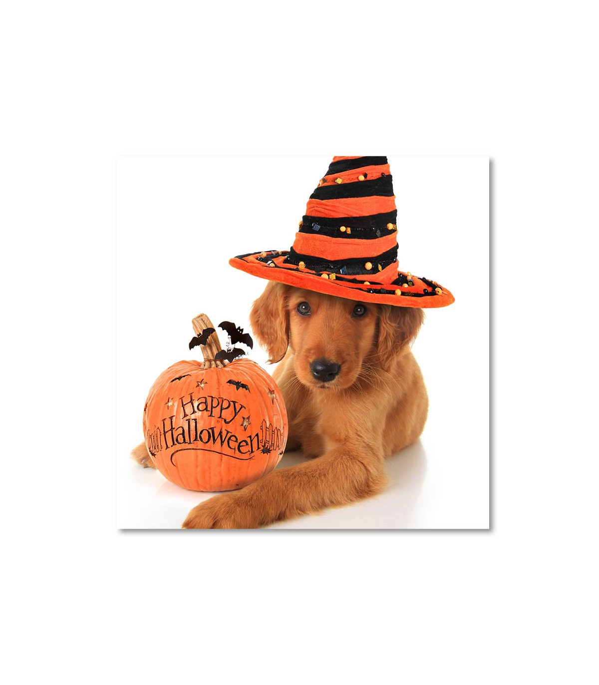 El cuadro perro Halloween muestra a un cachorro con sombrero de bruja junto a una calabaza “Happy Halloween”. La escena combina tonos naranjas y blancos sobre fondo limpio, lo que aporta un punto festivo y dulce a cualquier pared. Es una pieza ideal para casas con peques, peluquerías caninas, clínicas veterinarias, tiendas de mascotas y negocios que quieran vestir su escaparate en octubre con un toque simpático.
