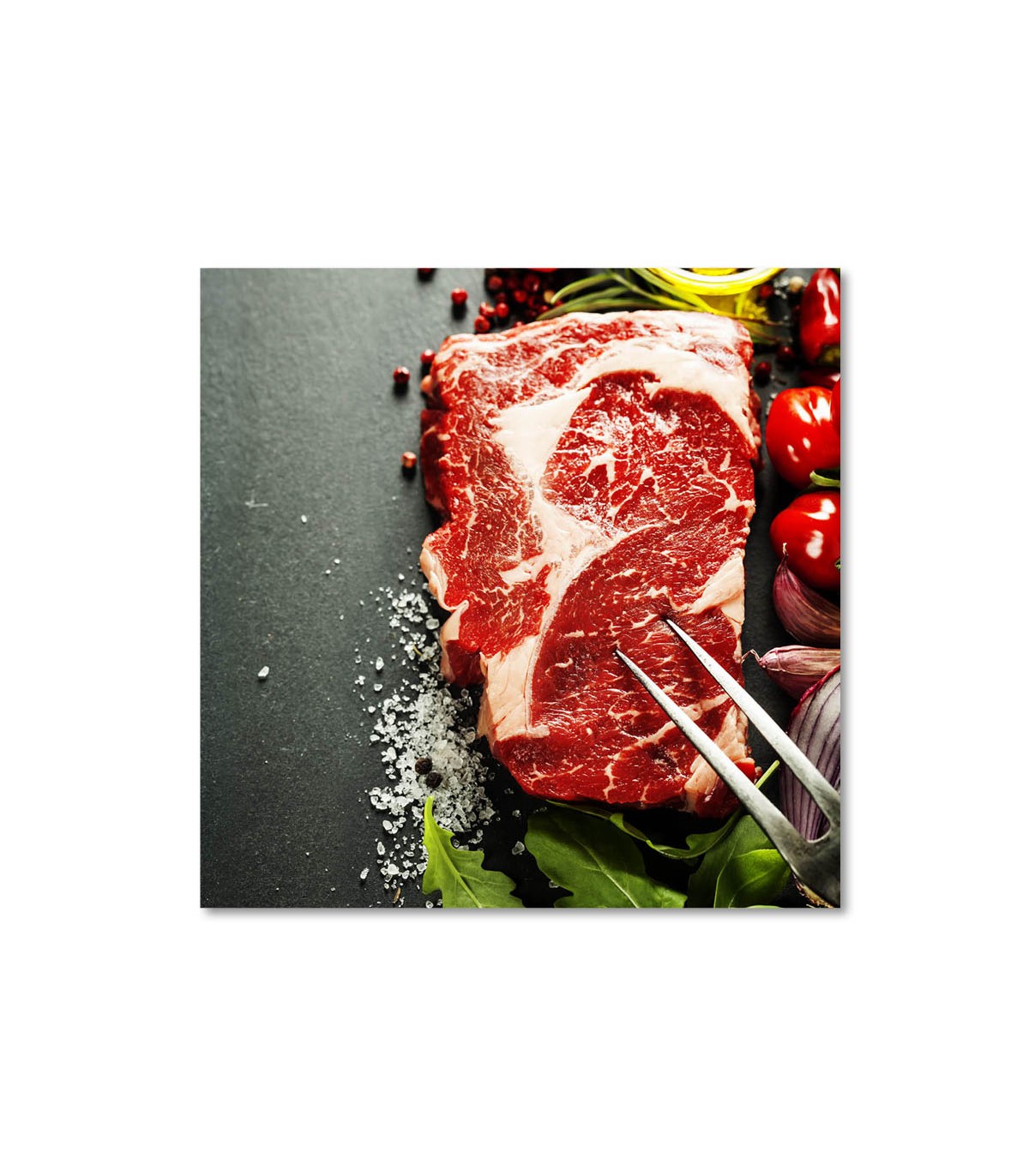 Este cuadro carne muestra una pieza de carne roja fresca sobre pizarra oscura, rodeada de sal en escamas, especias y vegetales. El contraste entre los rojos intensos de la carne y el fondo gris grafito aporta una estética culinaria moderna que encaja de maravilla en cocinas profesionales, parrillas, asadores y rincones gourmet en casa. La imagen transmite calidad del producto y pasión por la cocina bien hecha.