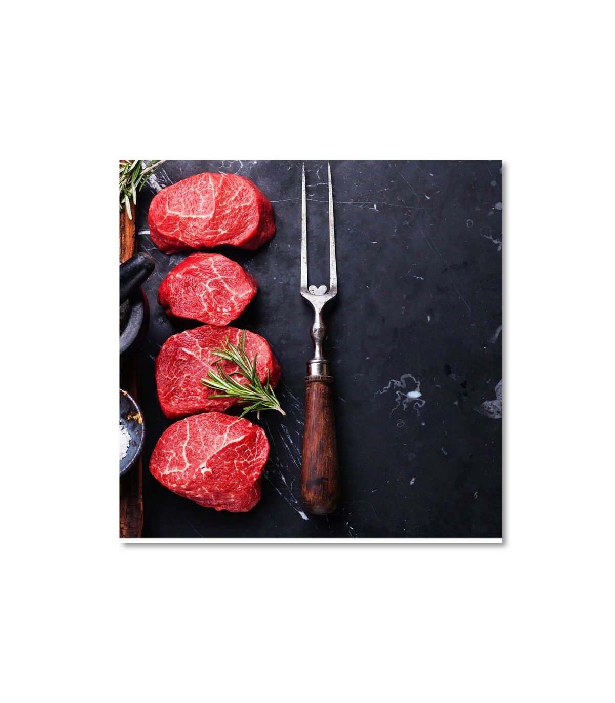 Este cuadro carne combina filetes frescos, romero y utensilios sobre pizarra oscura. Si no ves tu medida, ¡contáctanos!