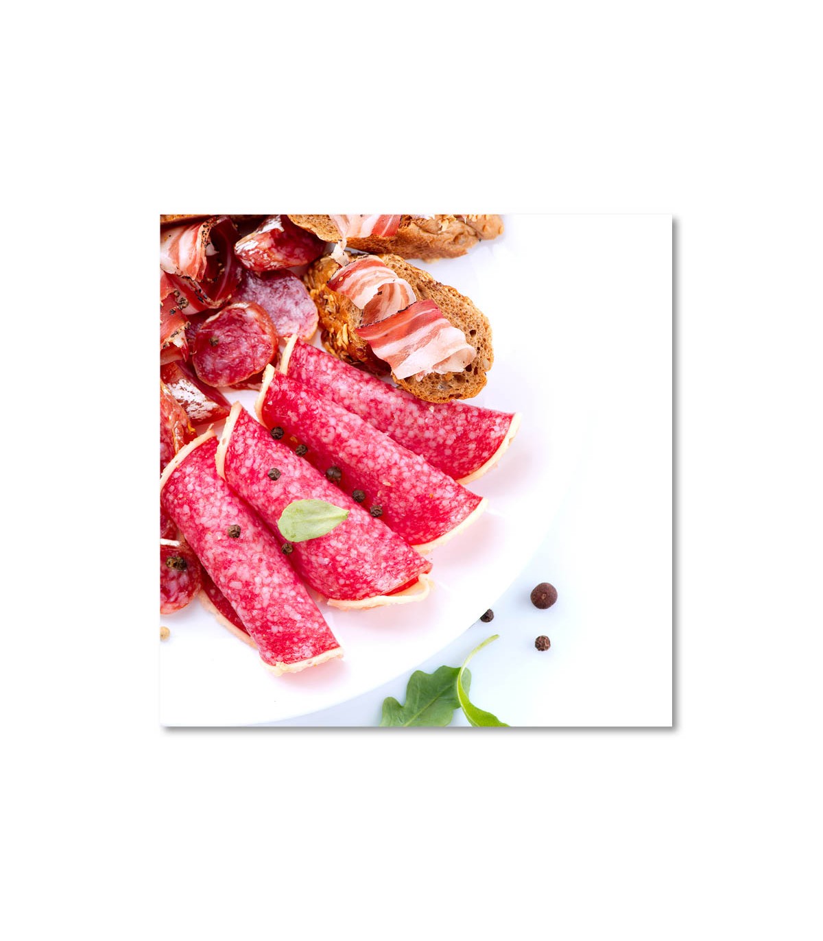 Este cuadro charcuteria muestra una apetecible selección de embutidos y tostas sobre plato blanco, con granos de pimienta y hojas frescas que aportan color y textura. El primer plano resalta el veteado del salami y la corteza crujiente del pan, generando una sensación culinaria muy realista. Es una pieza perfecta para cocinas domésticas, bares de tapas, vinotecas o restaurantes que desean transmitir calidad gastronómica y ambiente acogedor.
