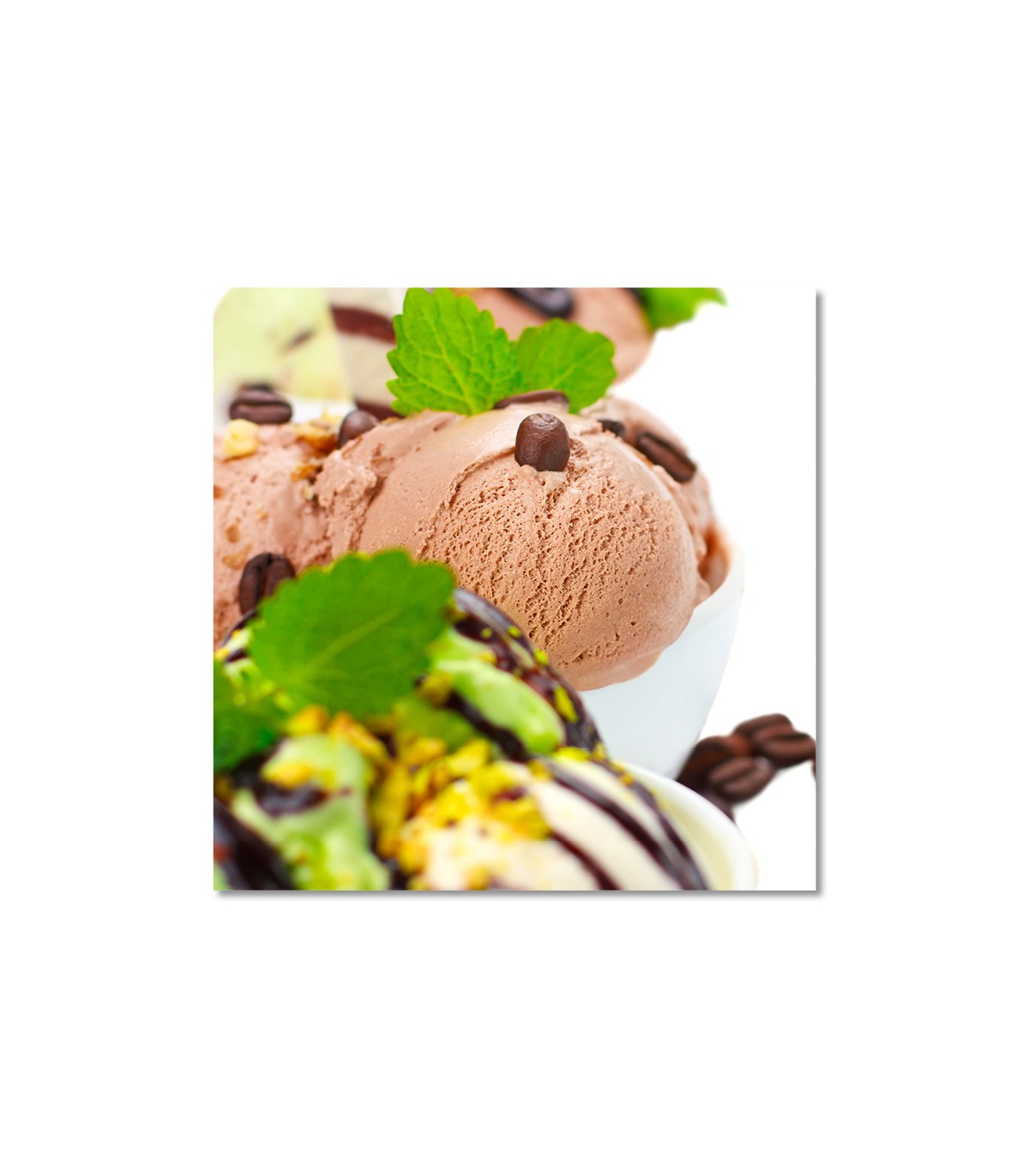 La impresion en alta resolucion permite apreciar la textura del helado, los brillos del sirope y el grano de frutos secos, aportando realismo sin saturar. Gracias a esta nitidez, el cuadro helado chocolate con menta mantiene impacto visual incluso en formatos grandes, con una lectura clara a diferentes distancias. La composicion concentra el protagonismo en la bola de cacao coronada con menta fresca, un recurso visual que aporta equilibrio y una nota refrescante.
