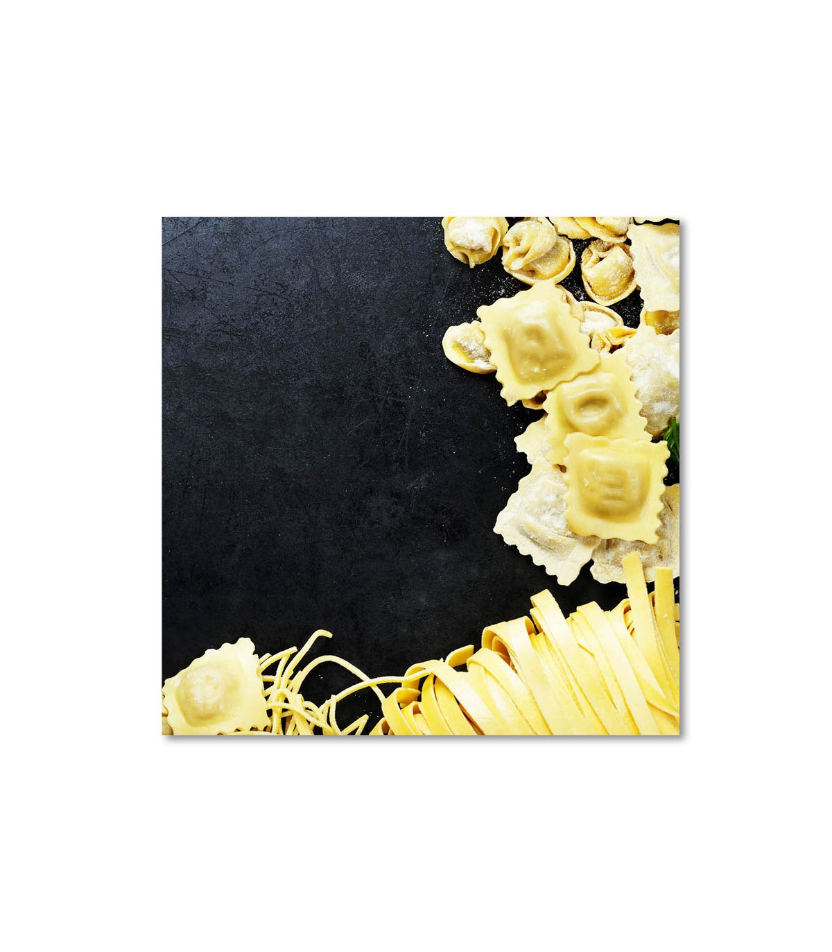 El cuadro pasta fresca y ravioli presenta una composición minimalista y muy apetecible: láminas de tagliatelle y ravioli espolvoreados de harina sobre una superficie negra de aspecto pizarra. El contraste entre el amarillo de la pasta y el fondo oscuro genera un efecto elegante que encaja en cocinas luminosas, trattorías modernas o barras con estética industrial.