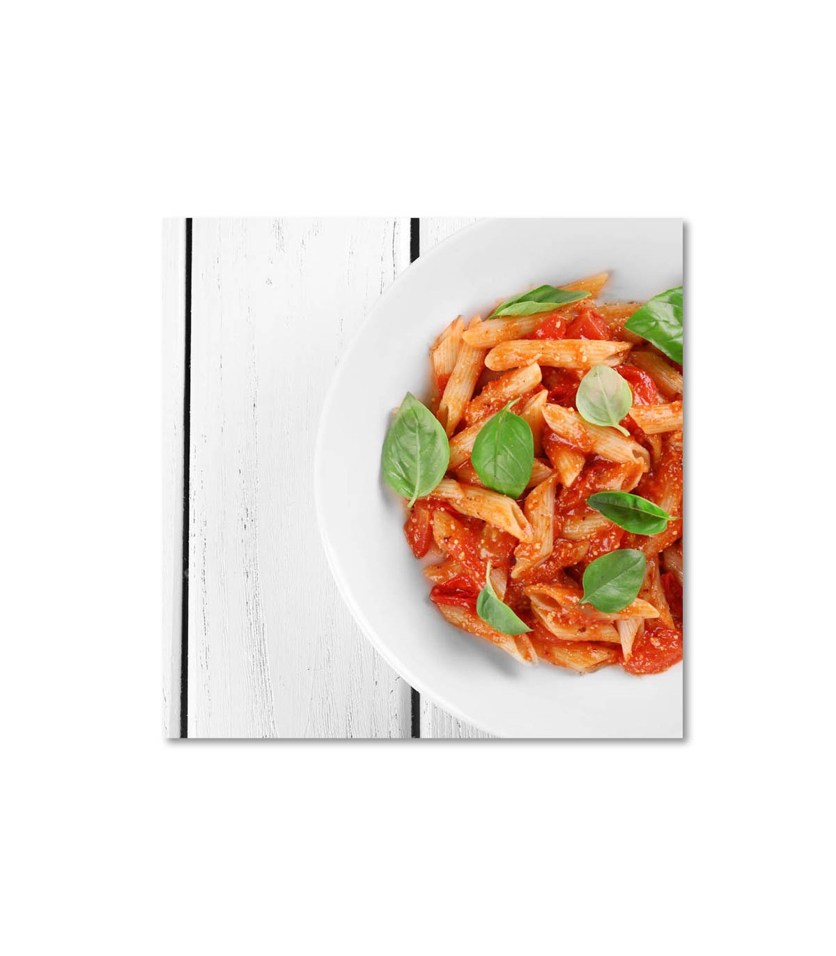El cuadro penne al pomodoro presenta un plato blanco visto en primer plano con pasta penne bañada en salsa de tomate y hojas de albahaca fresca sobre una mesa de madera pintada en blanco. El contraste entre los rojos intensos y los verdes vivos genera una imagen limpia, apetecible y muy luminosa, perfecta para cocinas domésticas, trattorías, pizzerías o zonas de autoservicio donde quieras transmitir frescura y cocina casera.