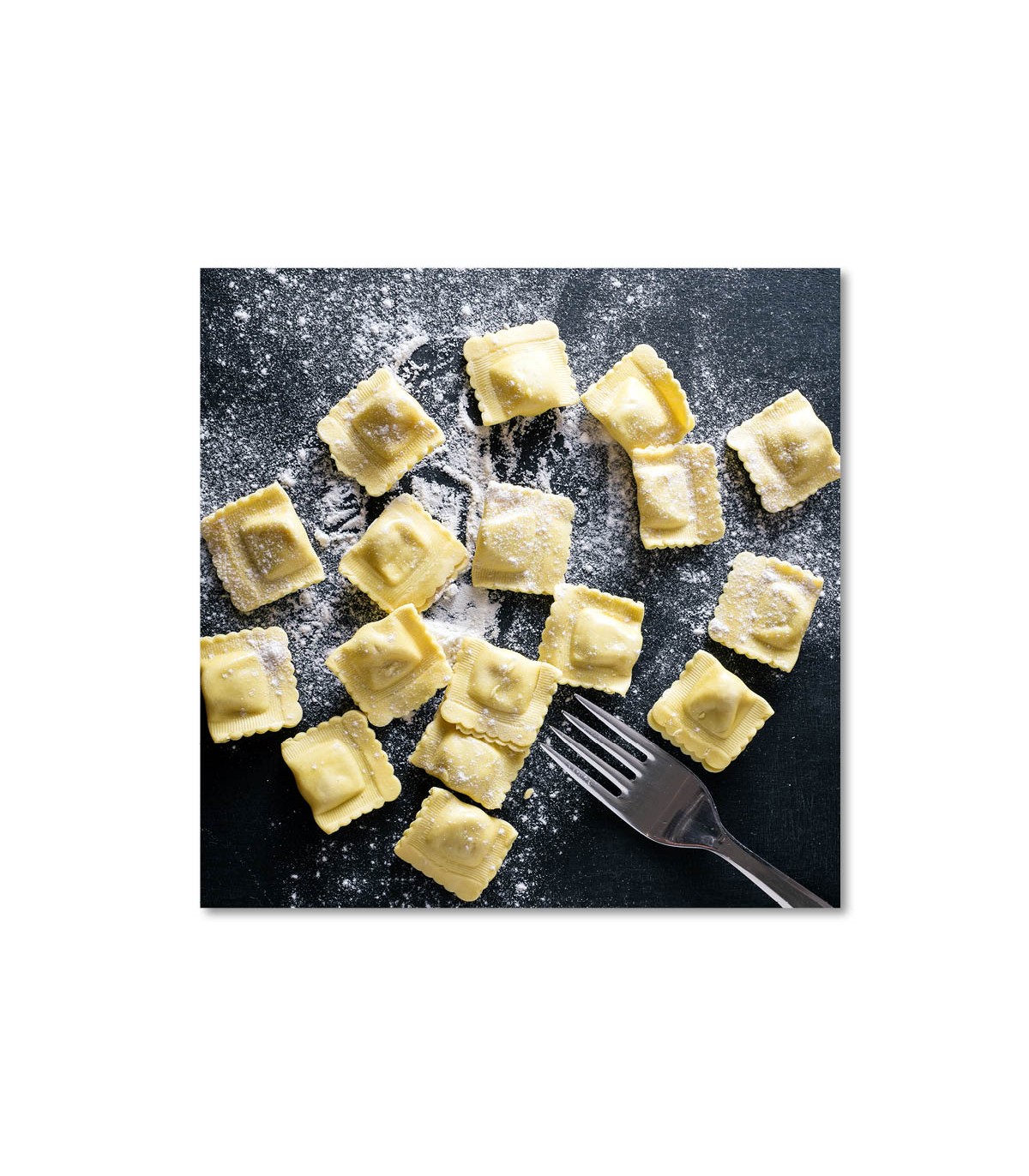 El cuadro ravioli y harina muestra una composición culinaria muy apetecible: pequeños ravioli de pasta fresca, ligeramente enharinados, distribuidos sobre una superficie oscura junto a un tenedor metálico. El contraste entre el negro de la piedra y el amarillo de la pasta genera una imagen limpia, moderna y muy gastronómica que encaja en espacios domésticos y profesionales.