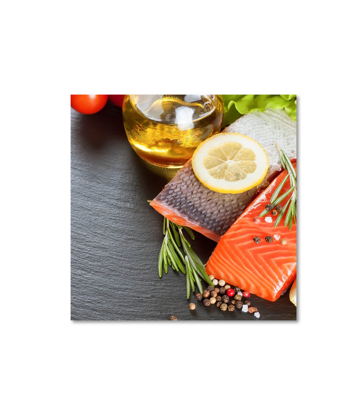 Imprimimos la fotografía en alta resolución para que cada detalle se perciba nítido: la veta del salmón, los cristales de sal y las hierbas aromáticas. El fondo de pizarra aporta contraste y elegancia, combinando muy bien con muebles de madera, encimeras de piedra o azulejos blancos. Si buscas una pieza sencilla, luminosa y con temática culinaria, este diseño encaja a la perfección.