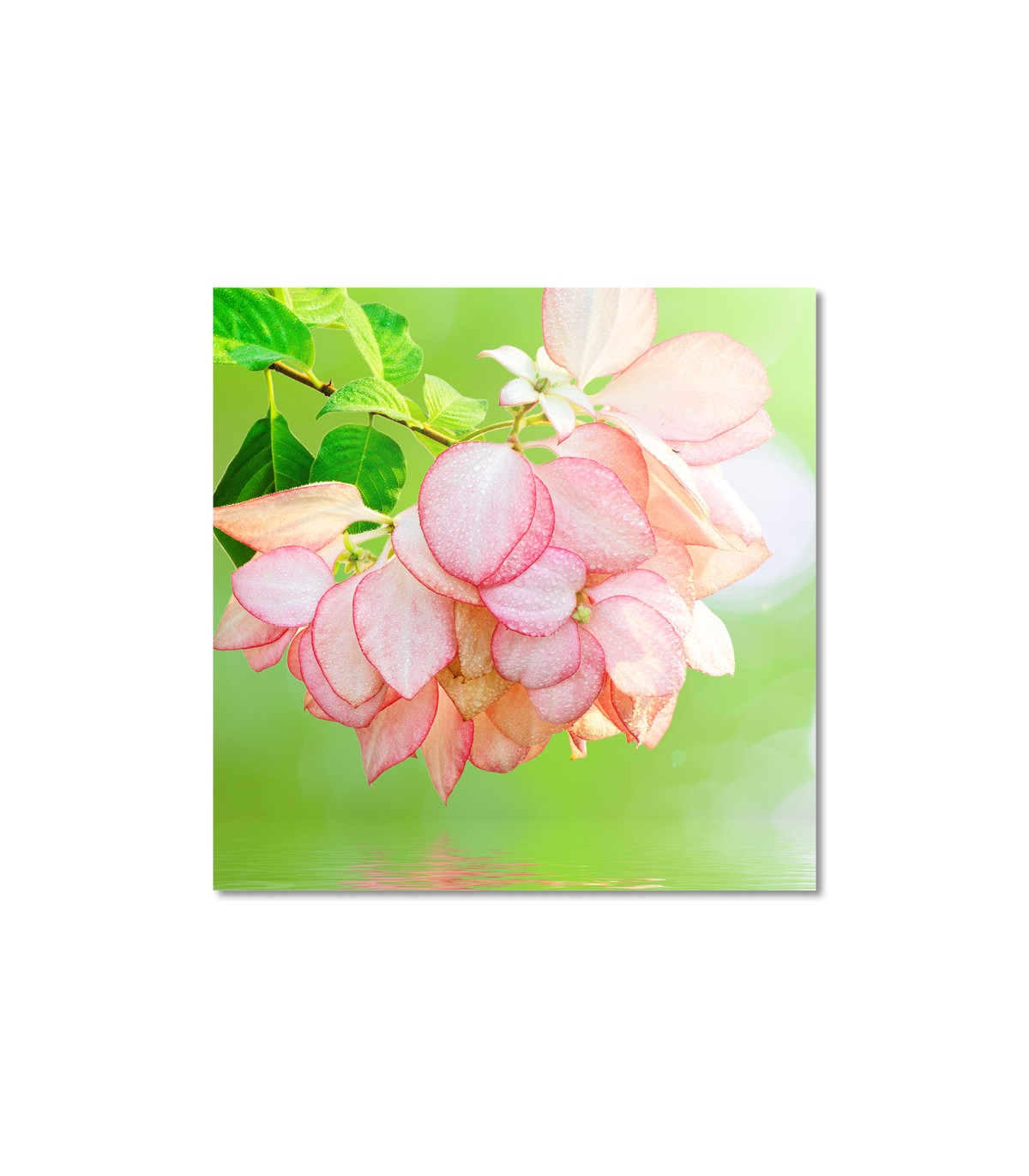 El cuadro flores rosa sobre agua muestra un racimo de petalos suaves con gotas que brillan sobre un fondo verde muy luminoso. La escena transmite calma y frescura, ideal para zonas de descanso, recepcion de floristeria o rincones de lectura en casa. La composicion deja aire en la parte baja con un reflejo sutil, lo que genera sensacion de espacio y un toque de naturaleza limpia y ordenada.