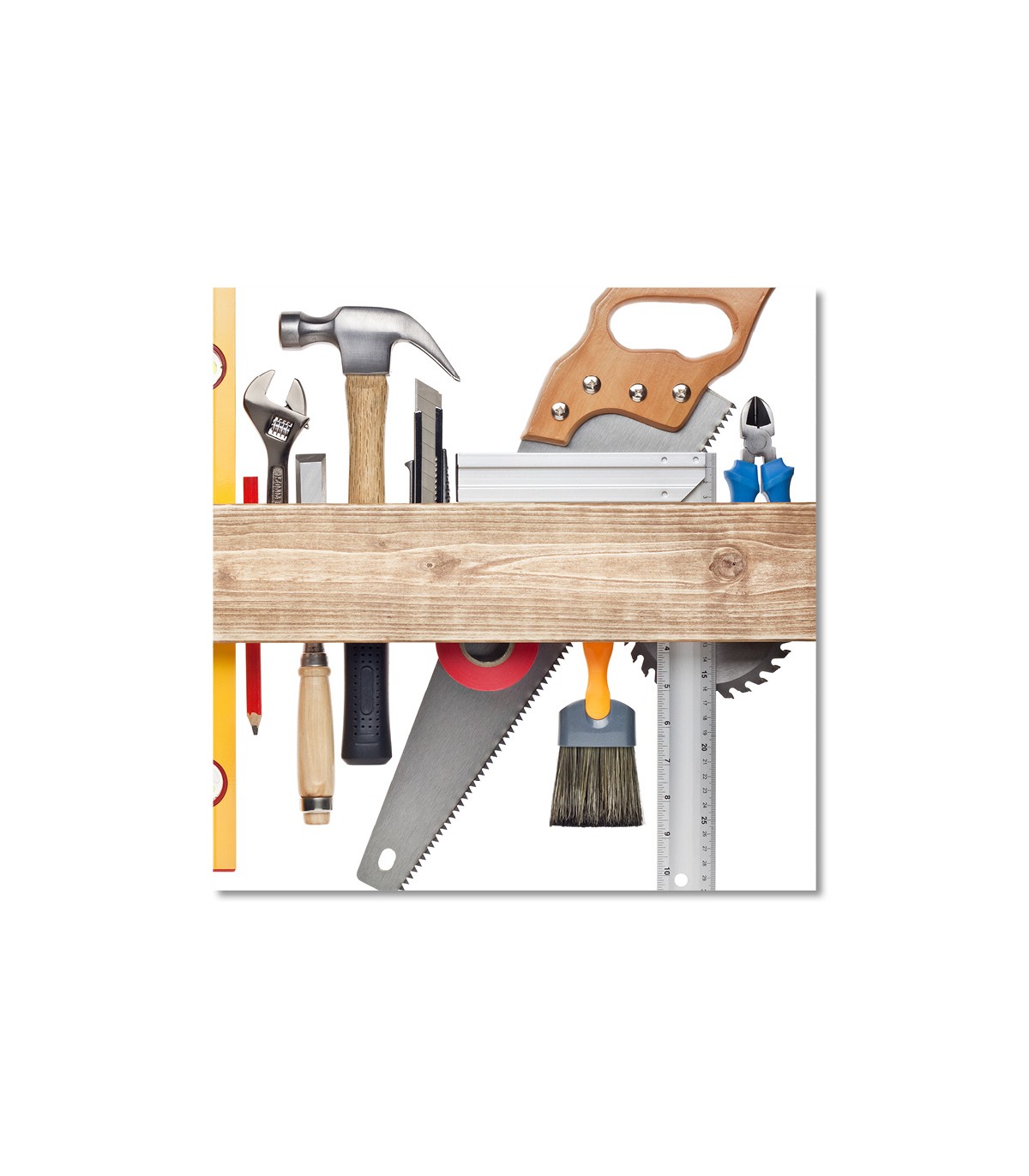El cuadro ferreteria muestra una selección ordenada de herramientas sobre una balda de madera clara: martillo, llaves, nivel, sierra y útiles de medición. La composición es precisa y minimalista, ideal para quienes buscan un estilo industrial sin sobrecargar. En casas modernas, talleres, despachos técnicos o comercios del sector, este motivo transmite oficio, exactitud y confianza.