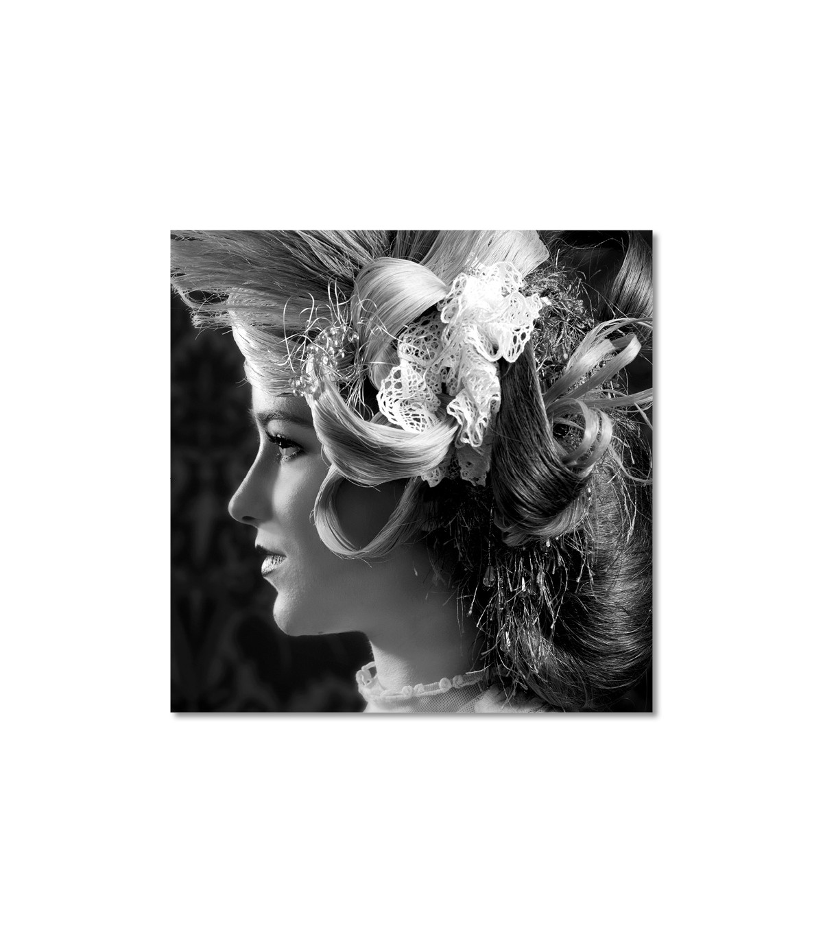 Este cuadro en blanco y negro captura un peinado de inspiración vintage con un nivel de detalle que enamora: el volumen trabajado, la textura del cabello y los adornos artesanales resaltan con un contraste elegante. Es una pieza perfecta para salones de peluquería, academias de formación, barberías con estética clásica y zonas de espera donde buscas transmitir estilo, calma y profesionalidad. Además, la ausencia de color centra la atención en la luz, las sombras y las formas, aportando equilibrio visual a cualquier pared.