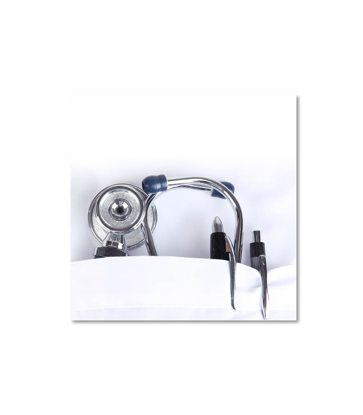 Este cuadro muestra un estetoscopio asomando del bolsillo de una bata blanca, un simbolo universal de atencion y confianza clinica. La imagen, limpia y luminosa, transmite orden, profesionalidad y cercania, por lo que resulta idonea para recepciones de clinicas privadas, consultas de medicina general, salas de curas, pasillos de centros de salud y espacios de enfermeria. El contraste entre el metal pulido y el textil aporta una lectura elegante y contemporanea que se integra facilmente en interiores minimalistas.