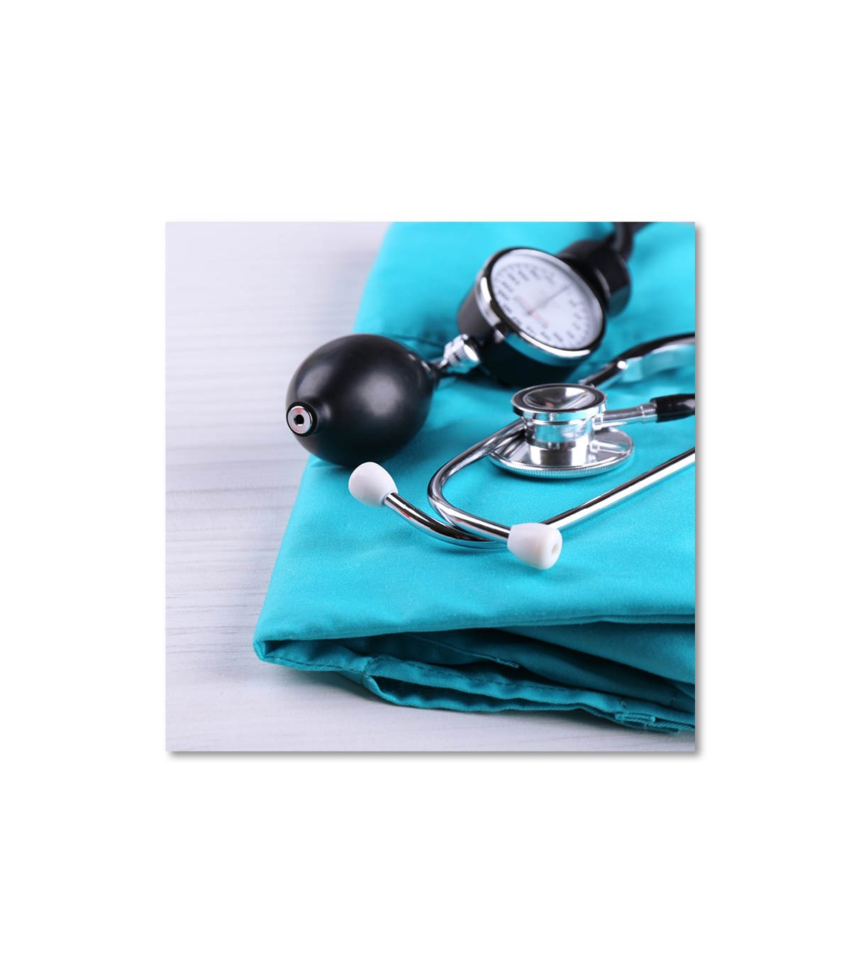 Este cuadro de tematica sanitaria muestra un estetoscopio junto a un tensiometro apoyados sobre tela clinica en tono turquesa. La escena es limpia y precisa, con brillos metalicos y superficies suaves que transmiten higiene, confianza y profesionalidad. Es una pieza versatil para recepciones, pasillos, salas de espera y consultas de medicina general, enfermeria, cardiologia, fisioterapia o unidades de diagnostico. La composicion dirige la mirada hacia el instrumental, reforzando la identidad visual del centro y generando sensacion de orden y cuidado en el detalle.