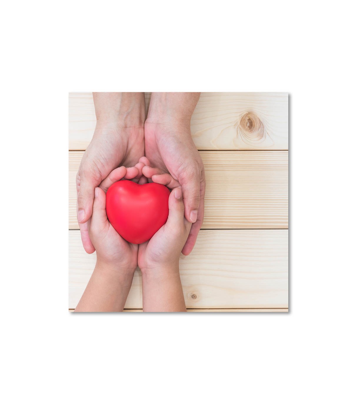 Este cuadro sanitario muestra unas manos de adulto que protegen y acompañan las manos de un niño mientras sostienen un corazón rojo. Es una imagen potente y positiva que comunica cercanía, cuidado y calidez humana, ideales para áreas de atención al paciente. Su composición centrada y el fondo de madera clara ofrecen una estética limpia y amable, perfecta para hospitales, clínicas privadas, consultas de cardiología, pediatría o medicina familiar, así como para salas de espera y zonas de recepción donde se busca reducir la ansiedad del visitante.