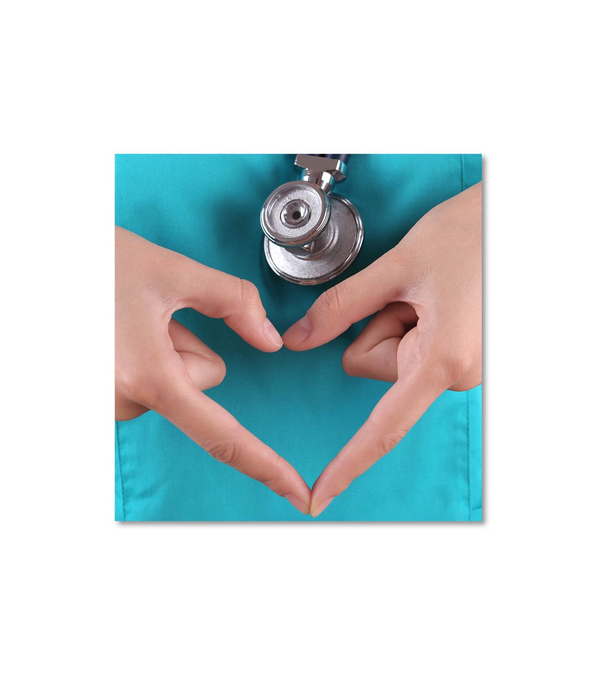 Este cuadro muestra unas manos formando un corazon sobre una bata turquesa, con un estetoscopio en primer plano. La escena transmite cuidado, cercania y profesionalidad, valores clave para cualquier clinica u hospital. La imagen es clara y amable, reduce la sensacion de frio clinico y genera confianza desde el primer vistazo.