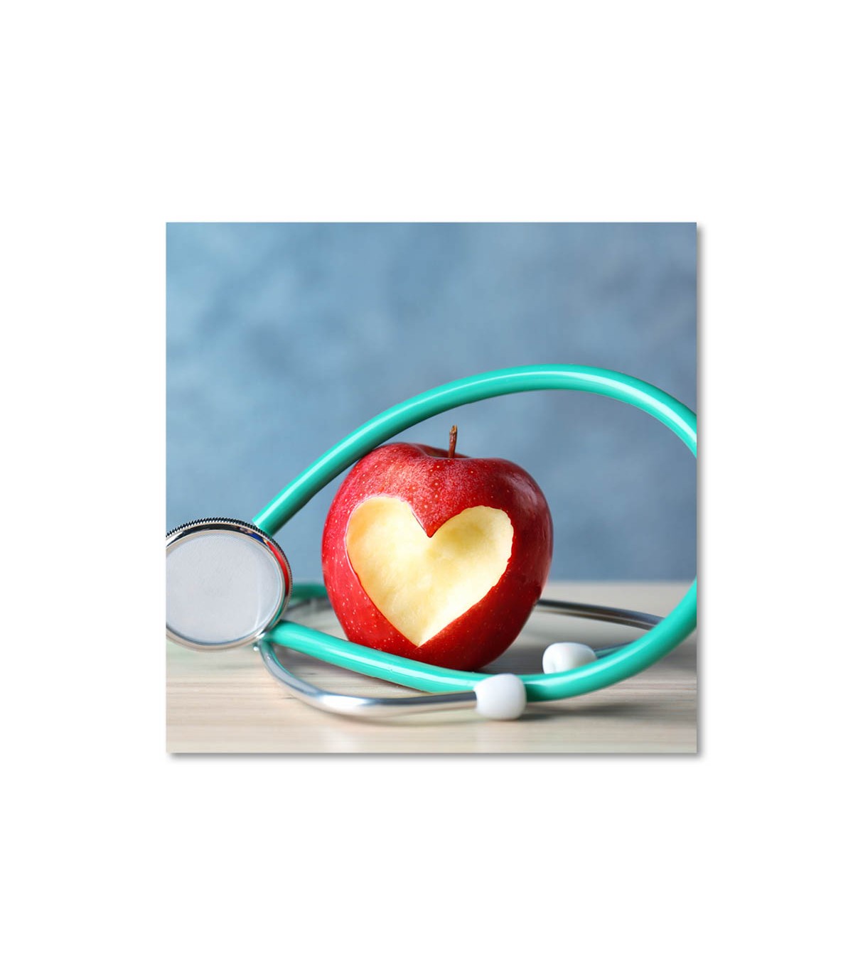 Este cuadro muestra una manzana roja con un corazon tallado en su pulpa, rodeada por un estetoscopio de color verde. Es una escena sencilla y directa que asocia la alimentacion saludable con el cuidado medico, perfecta para transmitir bienestar, prevencion y cercania. Su fondo neutro y la composicion equilibrada aportan calma visual, por lo que encaja en recepciones, consultas de medicina general, nutricion y dietetica, cardiologia o fisioterapia, asi como en salas de espera y areas de atencion al paciente.