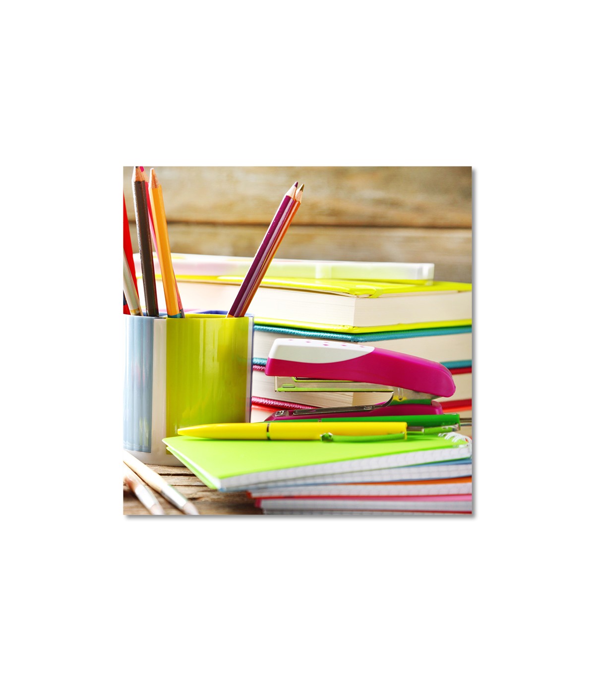 Este cuadro presenta una escena luminosa y llena de color con libretas, lápices, grapadora, bolígrafos y otros accesorios típicos del entorno de estudio. Su composición transmite orden, energía y creatividad, cualidades que favorecen la concentración y el aprendizaje. Gracias a su impresión en alta resolución, los detalles se aprecian con claridad: la textura del papel, los brillos del plástico y los tonos vivos que convierten cualquier pared en un punto focal inspirador.