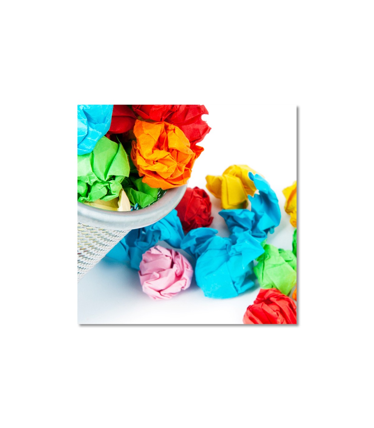 El cuadro papeleria papeles de colores arrugados muestra un cesto metálico volcado con bolas de papel de tonos vivos, creando una escena dinámica y creativa. Evoca ideas, bocetos y proceso de trabajo; ideal para colegios, papelerías, academias, bibliotecas y oficinas creativas.