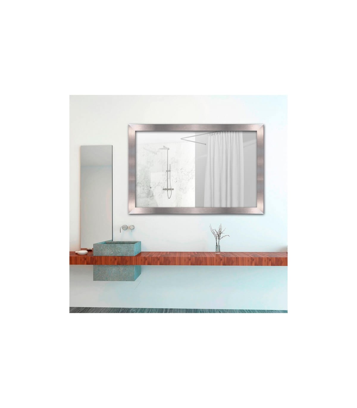 Espejo marco plata cepillado moderno para decorar y personalizar tu hogar, tu negocio o tu comercio. Se envía totalmente montado y preparado para colgar. Incluye kit de colgadores.