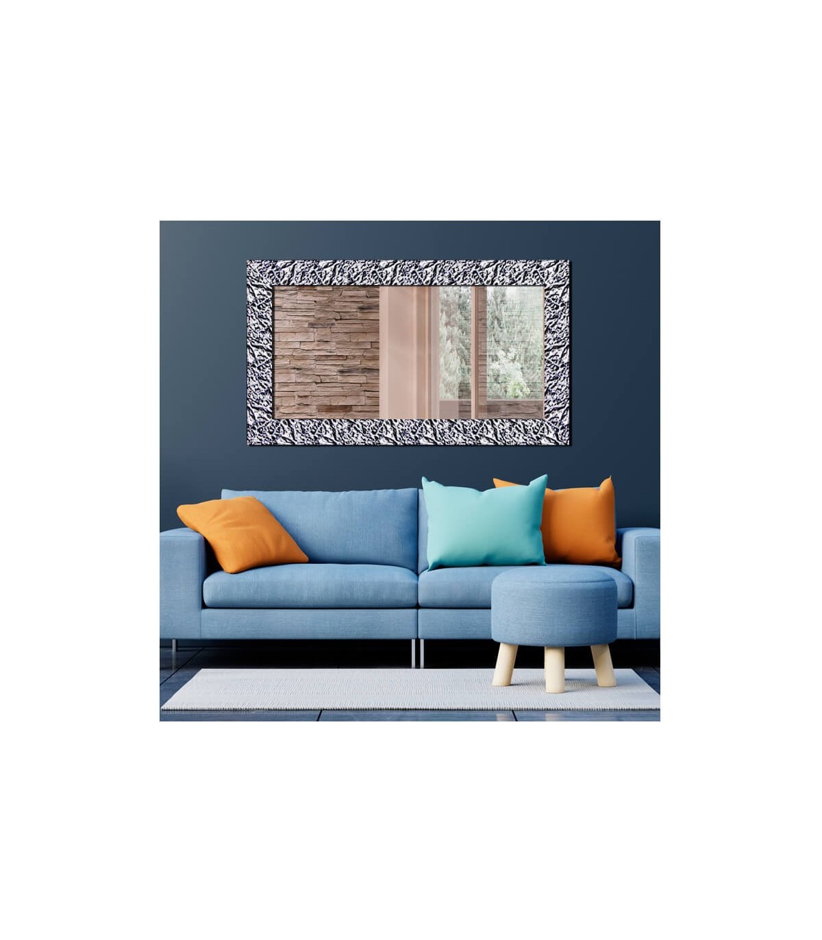 El espejo marco relieve negro y plata destaca por un contorno de textura marcada con volúmenes irregulares que generan reflejos dinámicos. El contraste entre negro y plata aporta carácter y profundidad, delimitando el cristal con nitidez y sumando presencia decorativa sin recargar la pared. Es una pieza de líneas actuales que encaja en ambientes modernos, industriales o minimalistas.
