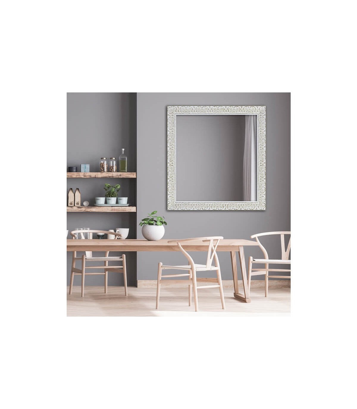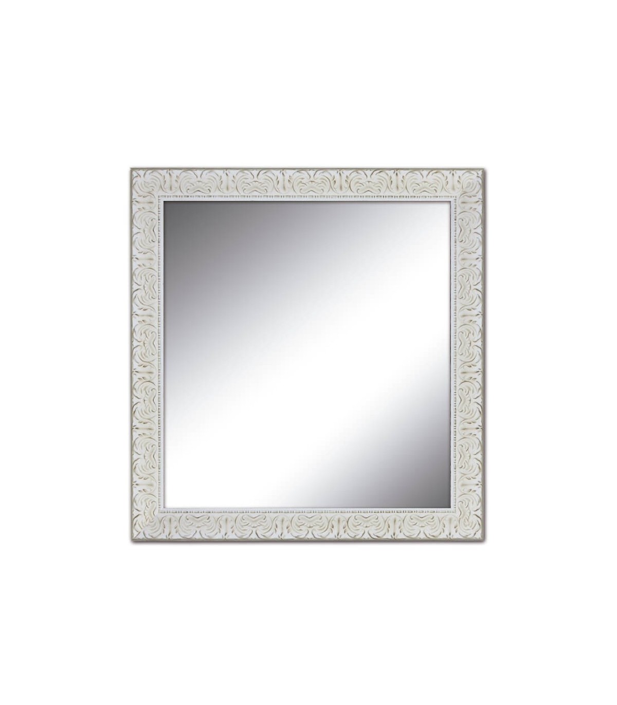 Espejo marco tallado blanco decapado para decorar y personalizar tu hogar, tu negocio o tu comercio. Se envía totalmente montado y preparado para colgar. Incluye kit de colgadores.