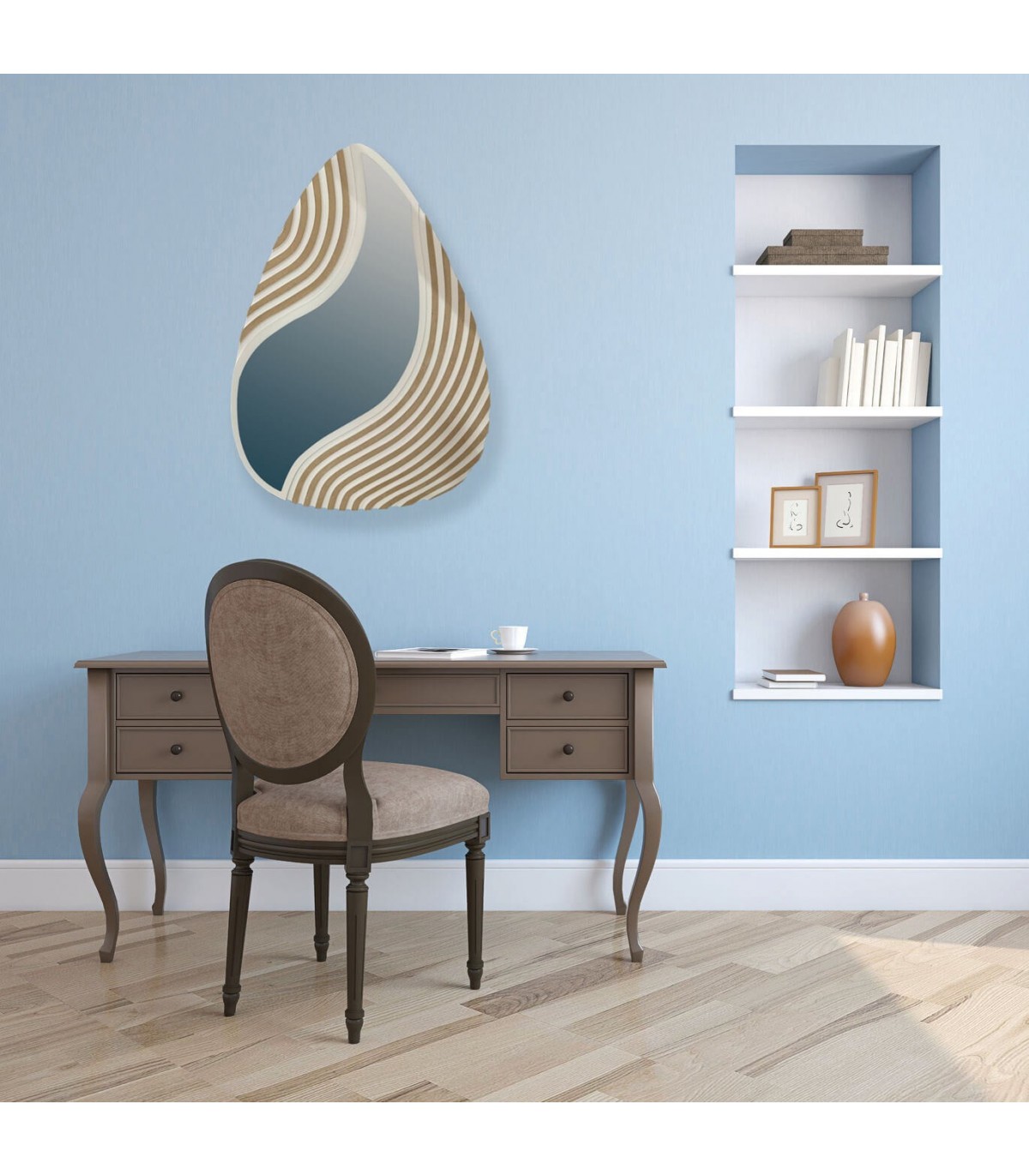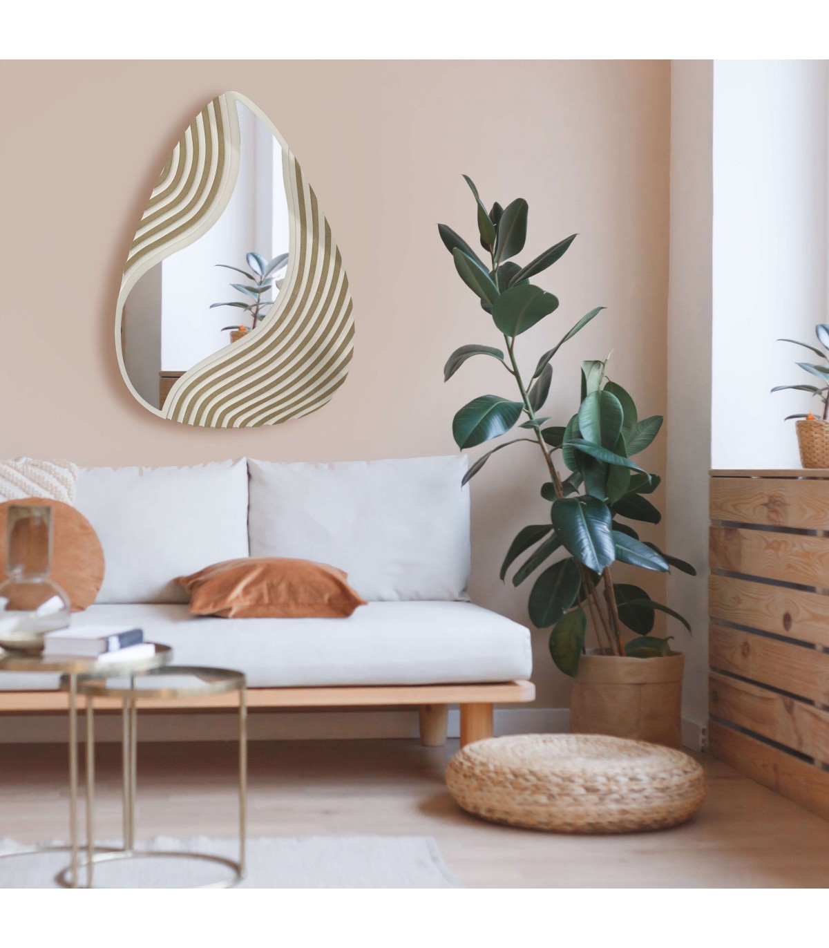El espejo forma gota beige dorado moderno combina curvas elegantes con una textura en relieve que refleja la luz de forma suave y natural. Su acabado en beige con reflejos dorados ofrece un equilibrio perfecto entre sobriedad y lujo, adaptándose fácilmente a espacios modernos, mediterráneos o contemporáneos. Este espejo añade calidez visual sin renunciar a un toque distinguido y actual.